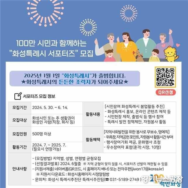 경기뉴스광장 최옥분 기자 |화성시가 오는 2025년 1월 특례시 출범을 앞두고 102만 시민이 함께 만들어 가는 화성특례시를 구현하기 위해 ‘화성특례시 서포터즈’를 모집한다고 30일 밝혔다.