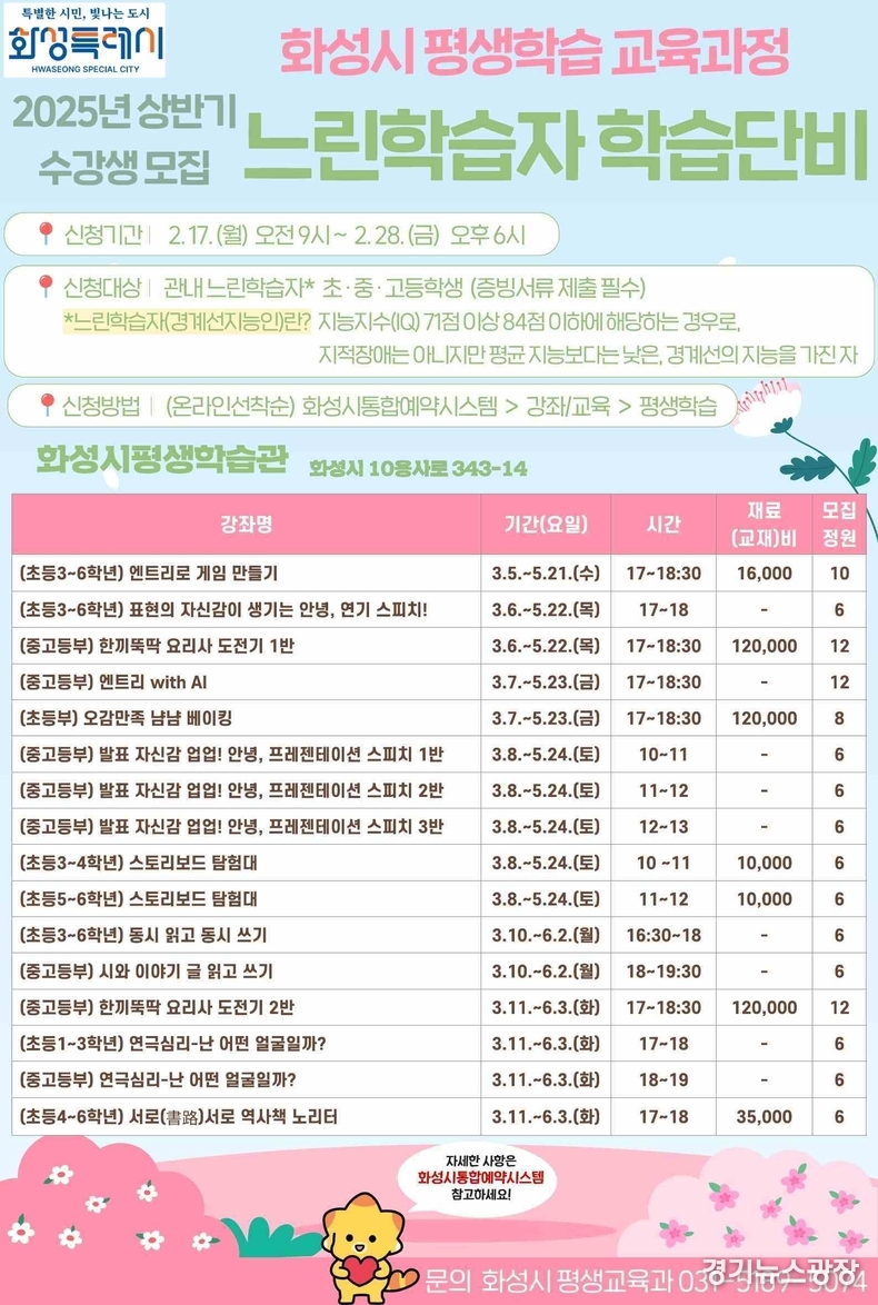 경기뉴스광장 최옥분 기자 |화성특례시는 2025년 ‘느린학습자 학습단비’ 상반기 수강생을 17일부터 오는 28일까지 선착순 모집한다.