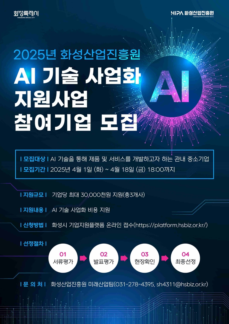 경기뉴스광장 정일수 기자 |화성산업진흥원(원장 전병선)이 오는 18일까지 ‘2025년 AI 기술 사업화 지원사업'에 참여할 기업을 모집한다.