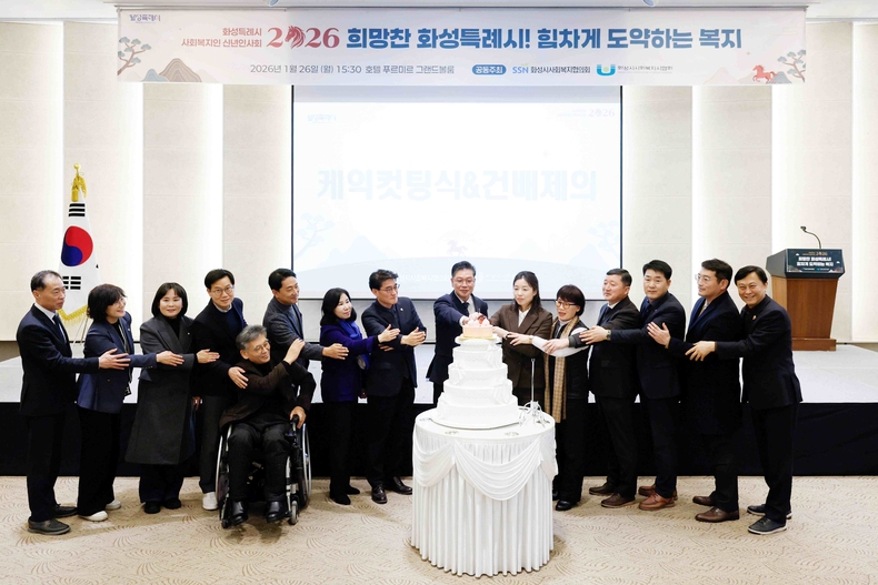 경기뉴스광장 정일수 기자 |화성특례시의회(의장 배정수)는 26일 호텔 푸르미르 그랜드볼룸에서 열린 ‘2026년 화성시사회복지협의회·사회복지사협회 신년인사회’에 참석해, 병오년 새해를 맞아 사회복지 종사자들과 함께 희망과 연대의 뜻을 나눴다.