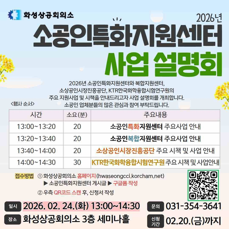 이번 사업설명회는 2026년 소공인특화지원센터에서 추진하는 주요 지원사업을 안내하고, 사업참여를 희망하는 소공인들의 이해를 돕기 위해 마련됐다. 또한, 화성소공인복합지원센터의 주요 지원사업 안내를 비롯해, 소상공인시장진흥공단, KTR 한국화학시험연구원의 주요 시책 설명이 진행될 예정이다.