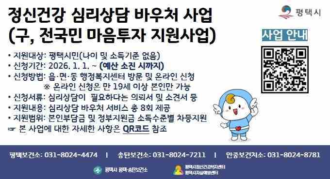 조미정 평택보건소장은 “이번 만족도 조사를 통해 시민들이 심리상담 서비스에 높은 신뢰와 만족을 보이고 있음을 확인했다”면서 “앞으로도 이용자 의견을 반영한 서비스 품질 개선으로 맞춤형 심리지원 서비스를 강화하겠다”고 밝혔다.