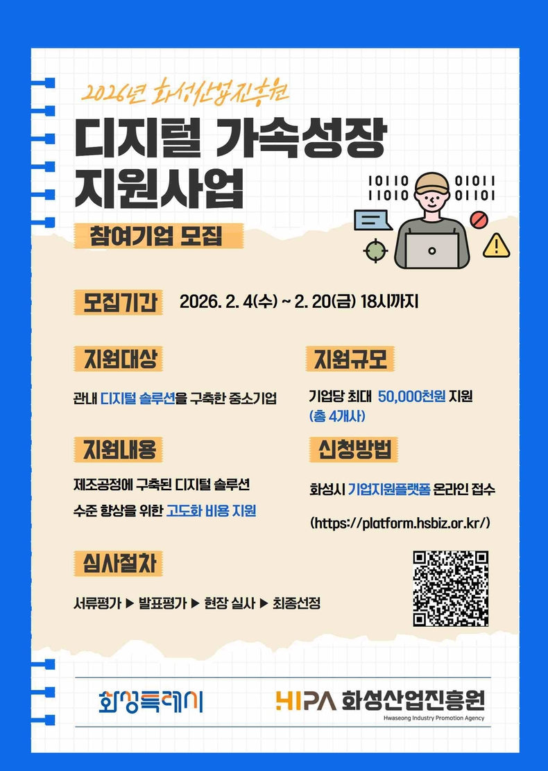 경기뉴스광장 정일수 기자 |화성산업진흥원이 기업 환경 전반의 디지털 혁신 확산과 생산성 향상을 지원하는‘2026년 디지털 가속성장 지원사업' 참가기업을 오는 20일까지 모집한다고 4일 밝혔다.