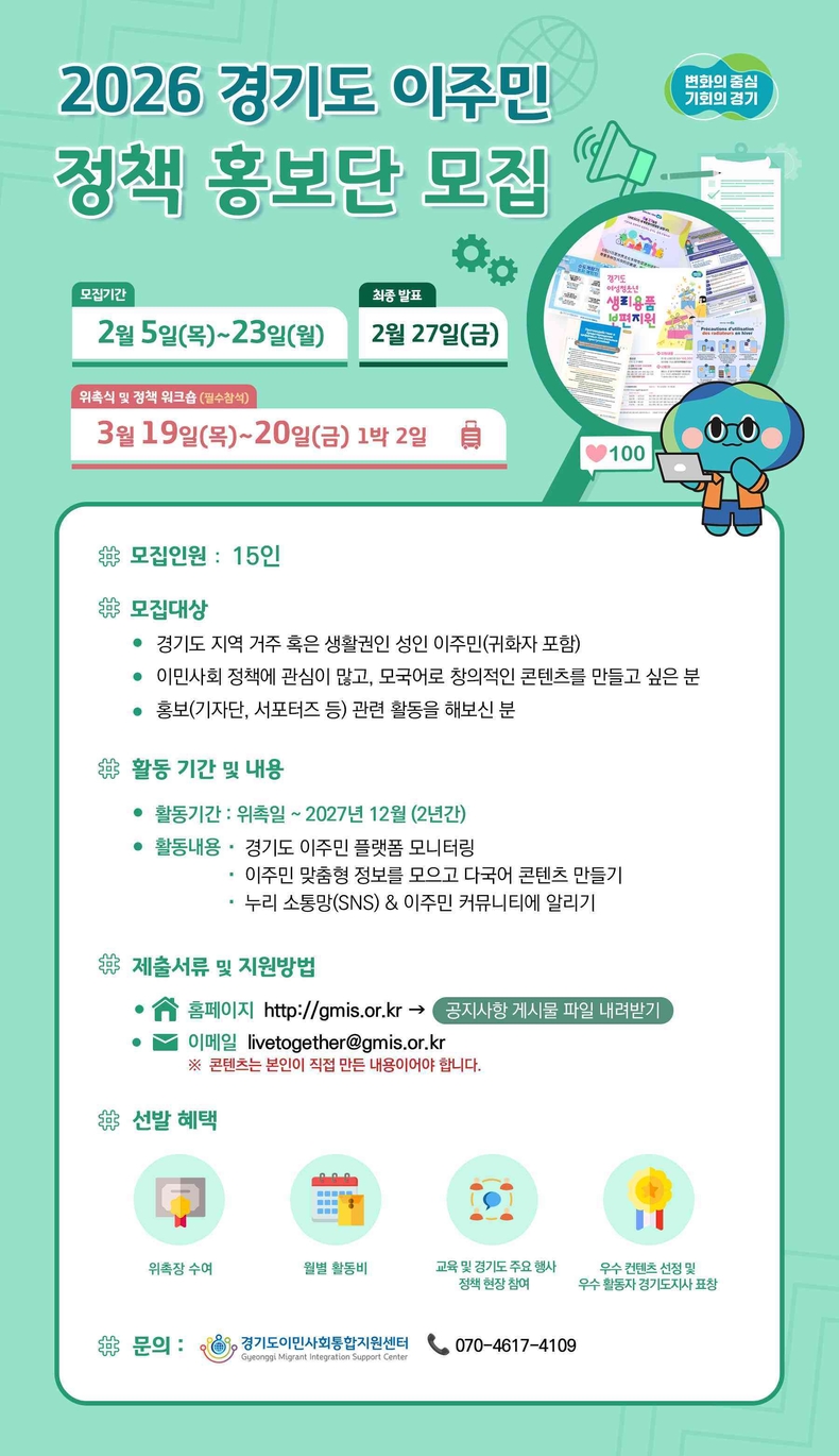 경기뉴스광장 강성규 기자 |경기도이민사회통합지원센터에서 오는 23일까지 ‘2026 경기도 이주민 정책 홍보단’ 15명을 모집한다.