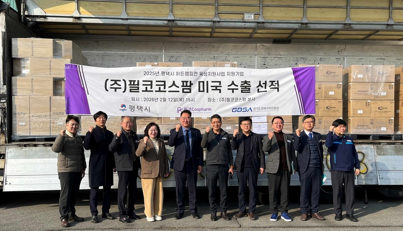 경기뉴스광장 정일수 기자 |평택시와 경기도경제과학진흥원 평택출장소의 대표 사업인 ‘히든챔피언 육성지원사업’을 통해 성공적으로 기술 개발을 완료한 ㈜필코코스팜(대표 정훈철)이 신제품의 미국 수출 선적식을 지난 12일 본사에서 가졌다.
