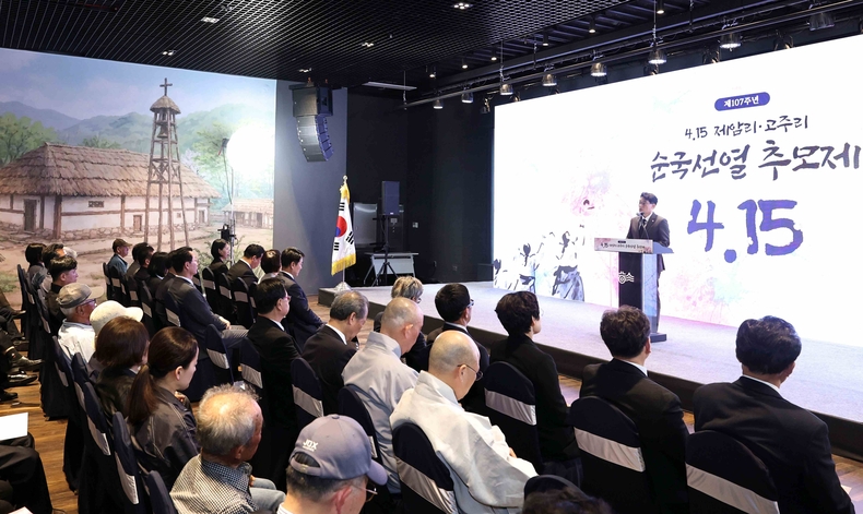 이날 행사장 벽면은 제암리와 고주리 마을에 봄꽃이 핀 평화로운 모습을 인공지능(AI) 이미지로 구현해 장식하며 추모의 의미를 더했다.