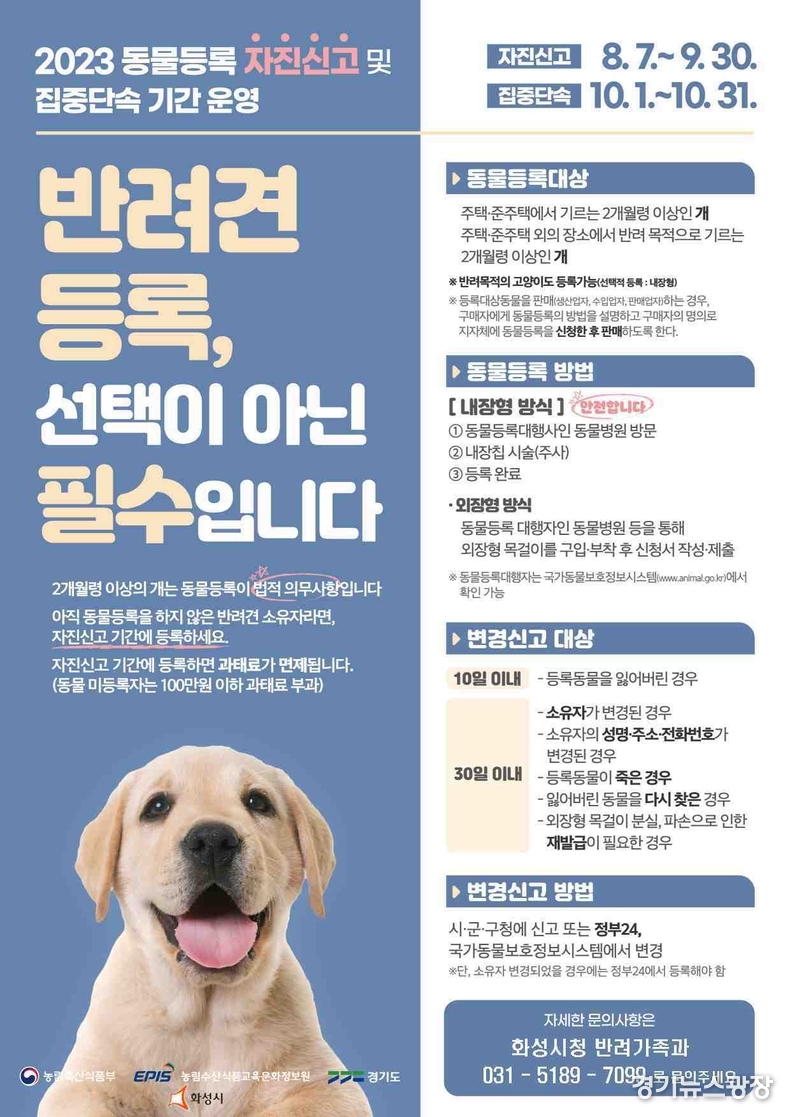 경기뉴스광장 최옥분 기자 |화성시(시장 정명근)가 오는 9월31일까지 반려견 소유자를 대상으로 ‘동물등록 자진신고 기간’을 운영한다고 14일 밝혔다.