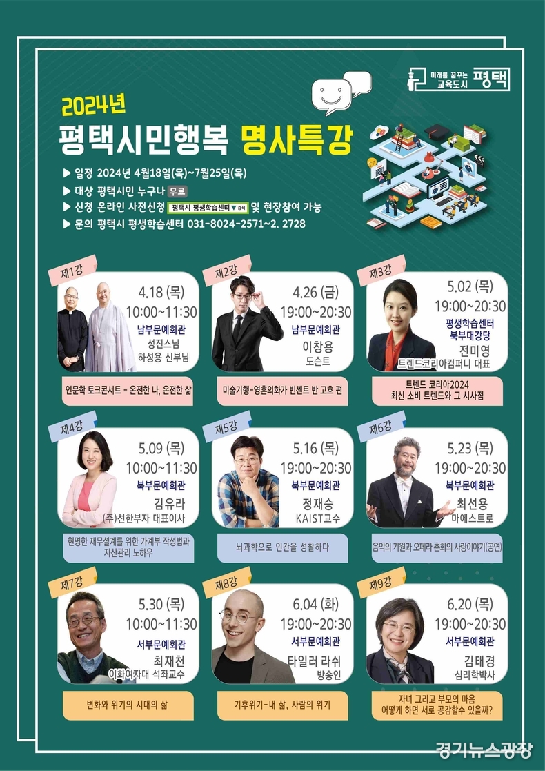경기뉴스광장 최옥분 기자 |평택시는 평생학습 활성화를 통한 시민의 행복 증진을 위해 노력하는 평택시의 평생학습사업의 하나로 대한민국 최고의 강사진으로 구성된 ‘2024년 평택시민행복 명사특강’ 강연을 오는 18일부터 운영한다.