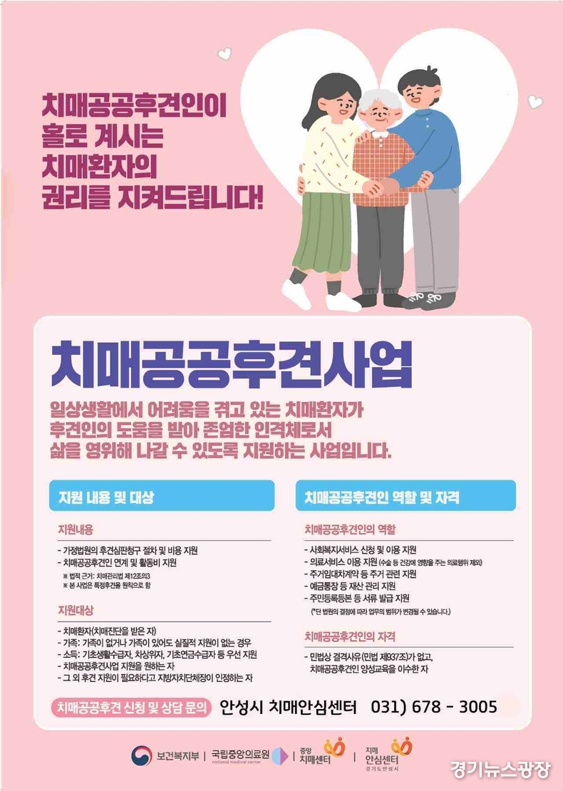 경기뉴스광장 최옥분 기자 |안성시보건소 치매안심센터는 치매로 인해 의사결정능력 저하로 어려움을 겪고 있는 취약계층 치매환자를 대상으로 치매공공후견사업을 적극 추진하고 있다.