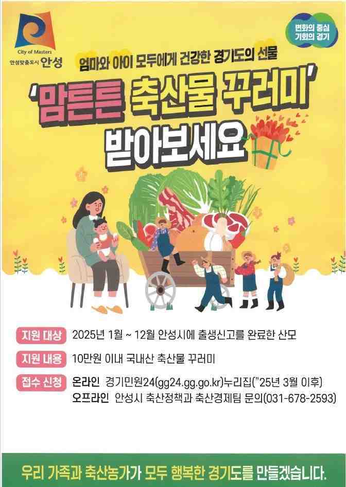 경기도에 주소를 두고 2025년 1월1일부터 12월31일까지 안성시에 자녀 출생신고를 마친 산모에게 10만원 상당의 국내산 축산물 꾸러미가 지원된다.