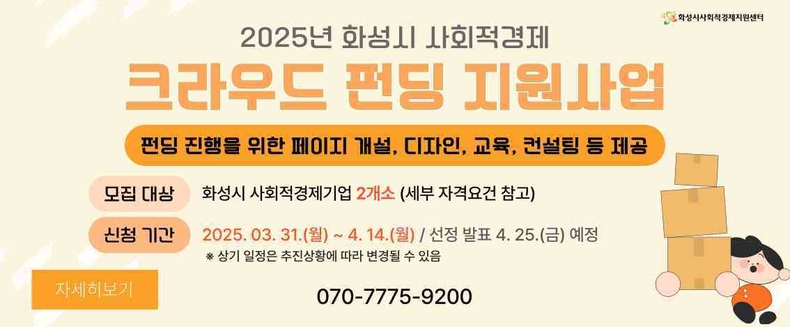 경기뉴스광장 정일수 기자 |화성특례시가‘2025년 화성시 사회적경제 크라우드펀딩 지원사업’으로 관내 사회적경제기업의 온라인 판로 확대에 나선다고 7일 밝혔다.