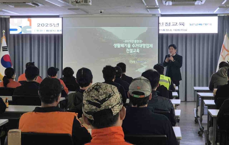 경기뉴스광장 정일수 기자 |화성특례시는 19일 동탄출장소 대회의실에서 동탄권역 생활폐기물 수거대행업체 민원응대 담당자 및 가로청소원 등 50여 명을 대상으로 친절교육을 실시했다.