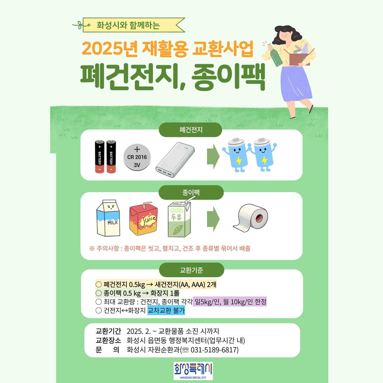 경기뉴스광장 정일수 기자 |화성특례시가 폐건전지와 종이팩의 올바른 배출을 유도하고 시민들의 분리배출 관심을 높이기 위해 ‘재활용품 교환사업’을 올해 2월부터 실시하고 있다고 26일 밝혔다.