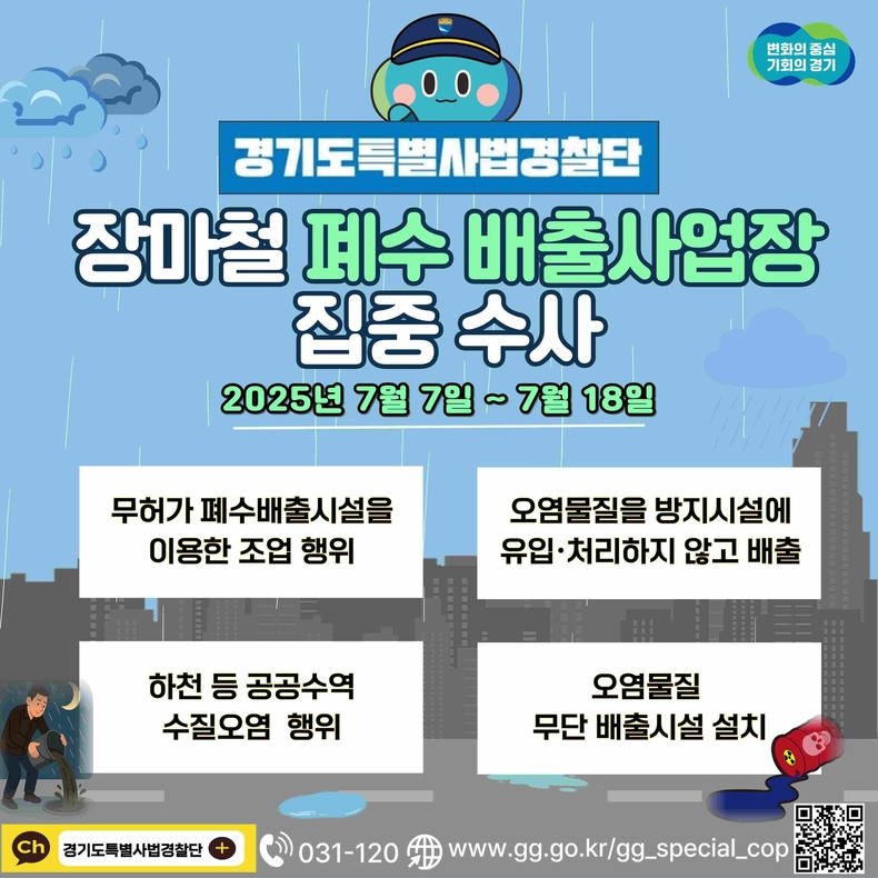 기이도 경기도 특별사법경찰단장은 “장마철 폐수 무단 방류 등 수질오염행위를 선제적으로 차단하기 위해 폐수 배출사업장을 대상으로 집중 수사를 실시하게 됐다”면서 “청정한 하천은 도민 모두의 공동 자산인 만큼 안전하고 깨끗한 하천환경을 누릴 수 있도록 최선을 다하겠다”고 밝혔다.