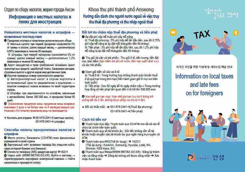시는 이에 따라 외국인 맞춤형 납세 홍보 수단으로 기존의 영어·중국어·베트남어 3개국 언어로 제작한 체납 안내 리플렛에 러시아어를 추가해 4개국 언어로 새롭게 제작했다. 포스터, 안내 전단지 등과 함께 외국인 관련 시설 및 단체와 읍·면·동사무소에 비치한다. 외국인이 많이 거주하는 지역에 대한 집중 홍보를 통해 납부 방법과 체납에 따른 불이익을 안내해 자진납부할 수 있도록 유도할 계획이다.