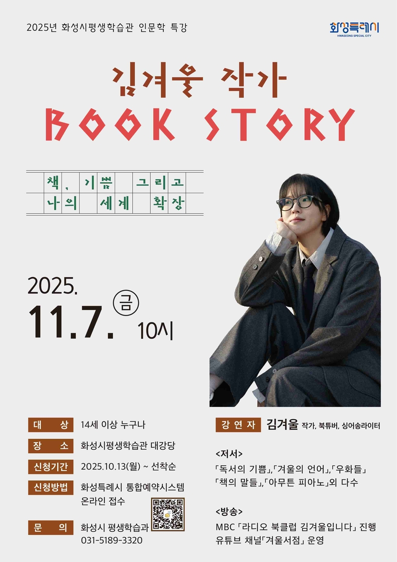 경기뉴스광장 정일수 기자 |화성특례시가 오는 11월7일 오전 10시 화성시평생학습관에서 김겨울 작가를 초청해 인문학 특강을 개최한다고 12일 밝혔다.