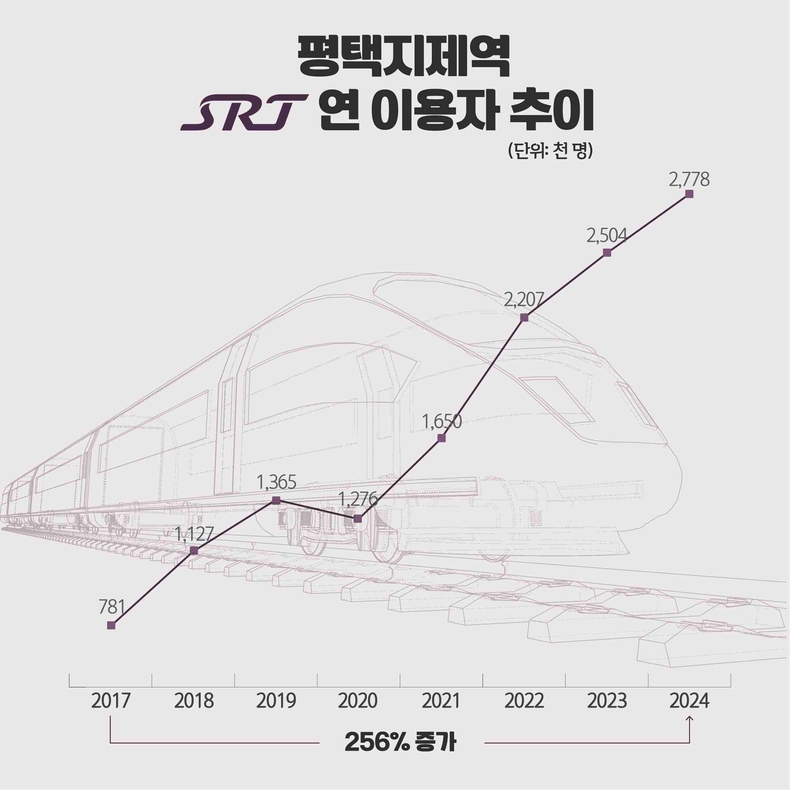 평택지제역은 2016년 개통 당시부터 SRT가 정차한 역사로, 매년 이용객 수가 꾸준히 증가하고 있다. 실제 ‘철도연감’에 따르면 평택지제역의 연간 SRT 승하차 인원은 2017년 78만1000명이었지만 2024년에는 277만8000명으로 256%의 증가율을 기록했다. 이러한 증가율은 SRT 역사 중 가장 높은 수치다.
