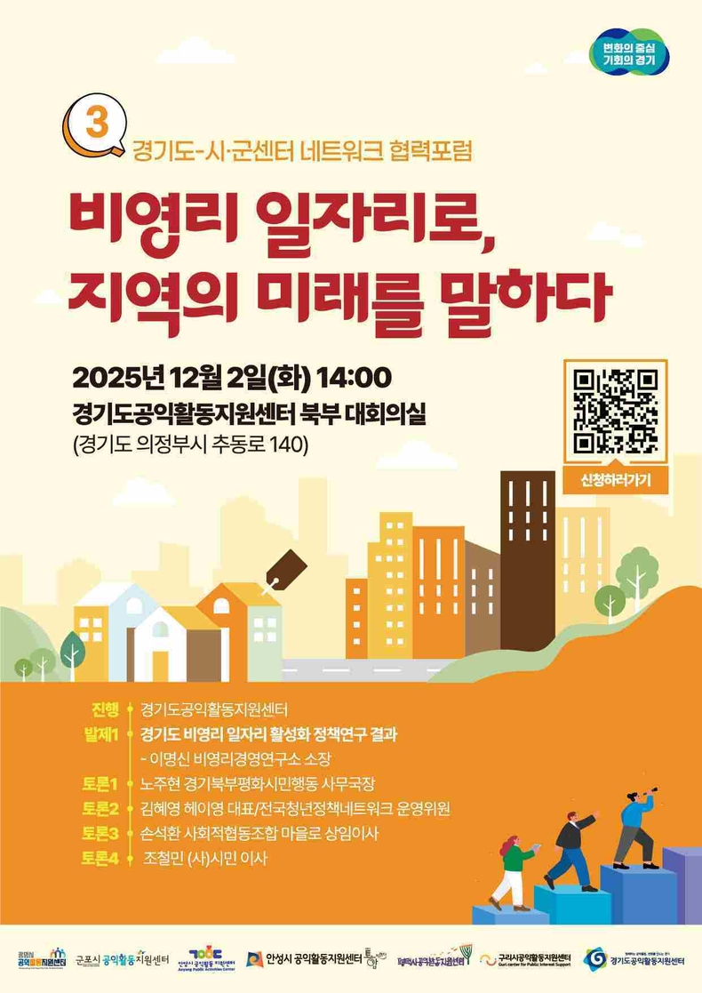 경기뉴스광장 정일수 기자 |경기도공익활동지원센터가 오는 18일 군포시공익활동지원센터, 11월 28일 평택대학교 제3국제관 e-컨버젼스홀, 12월2일 경기도공익활동지원센터 북부에서 각각 ‘경기도 비영리 일자리 활성화 정책연구’결과 확산을 위한 포럼을 연다.