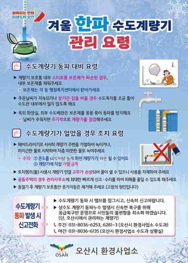 경기뉴스광장 정일수 기자 |오산시가 겨울철 기온 강하로 인한 수도계량기 동파·동결 사고 예방을 위해 이달부터 내년 3월까지 ‘겨울철 수도계량기 동파 예방 대책’을 본격 추진한다고 7일 밝혔다.
