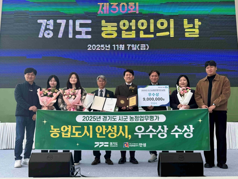 경기뉴스광장 정일수 기자 |안성시가 2025년 경기도 시·군 농정업무 평가에서 우수 기관으로 선정돼‘우수상’을 수상했다고 10일 밝혔다. 지난해 ‘장려상’을 받은데 이어 올해는 한 단계 도약한 성과를 거두며, 지역 농정 추진 역량을 다시 한번 입증했다.
