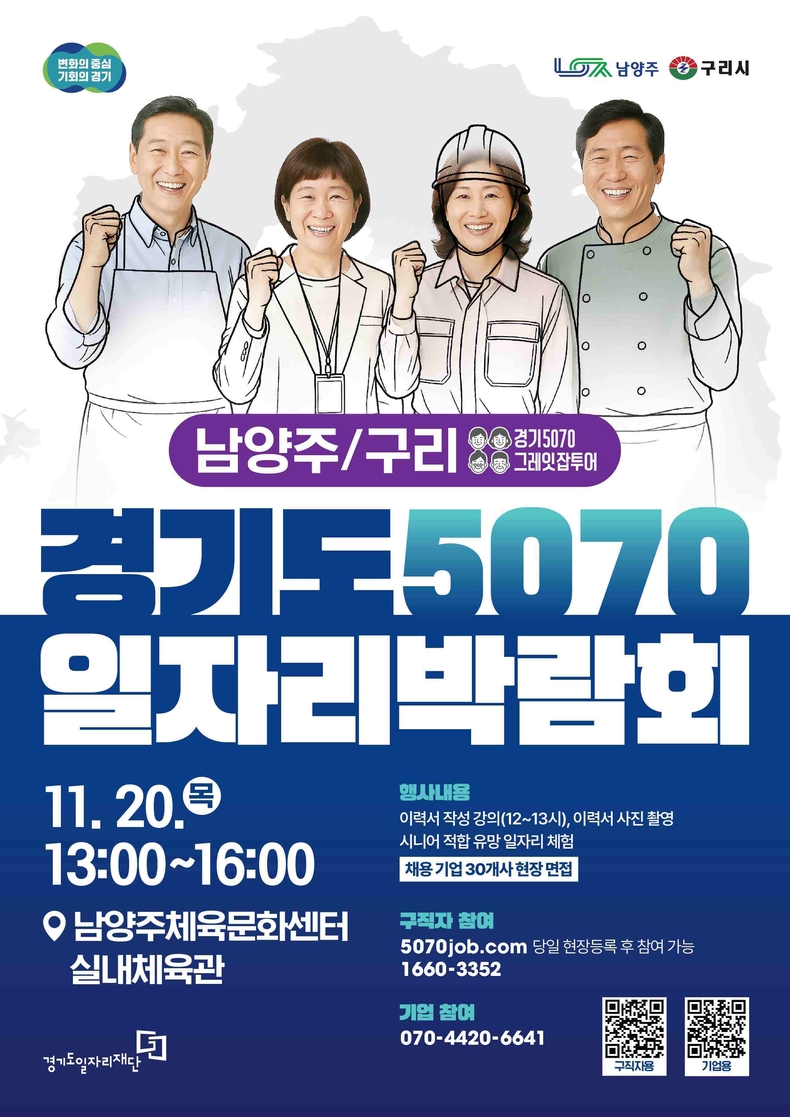 ‘경기도 5070 일자리박람회’는 도내 중장년 구직자의 재취업을 지원하는 ‘경기 5070 그레잇잡투어(Gray it-job tour)’의 하나로 마련됐다. 남양주일자리센터, 남양주시니어클럽 등 지역 일자리 유관기관과 협력해 5070세대 구직자에게 맞춤형 취업 기회를 제공할 계획이다.