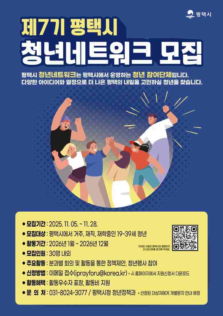 모집 기간은 오는 28일까지이며, 인원은 30명 내외로 2026년 1월부터 1년간 활동하게 된다. 평택시에 거주·재학·재직 중이거나 활동하는 청년(19~39세)이면 누구나 신청할 수 있다.