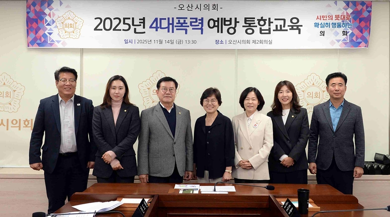 경기뉴스광장 정일수 기자 |오산시의회(의장 이상복)가 지난 14일 의회 제2회의실에서 의원과 의회사무과 직원을 대상으로 ‘4대 폭력(성희롱·성매매·성폭력·가정폭력) 통합 예방교육’을 실시했다.