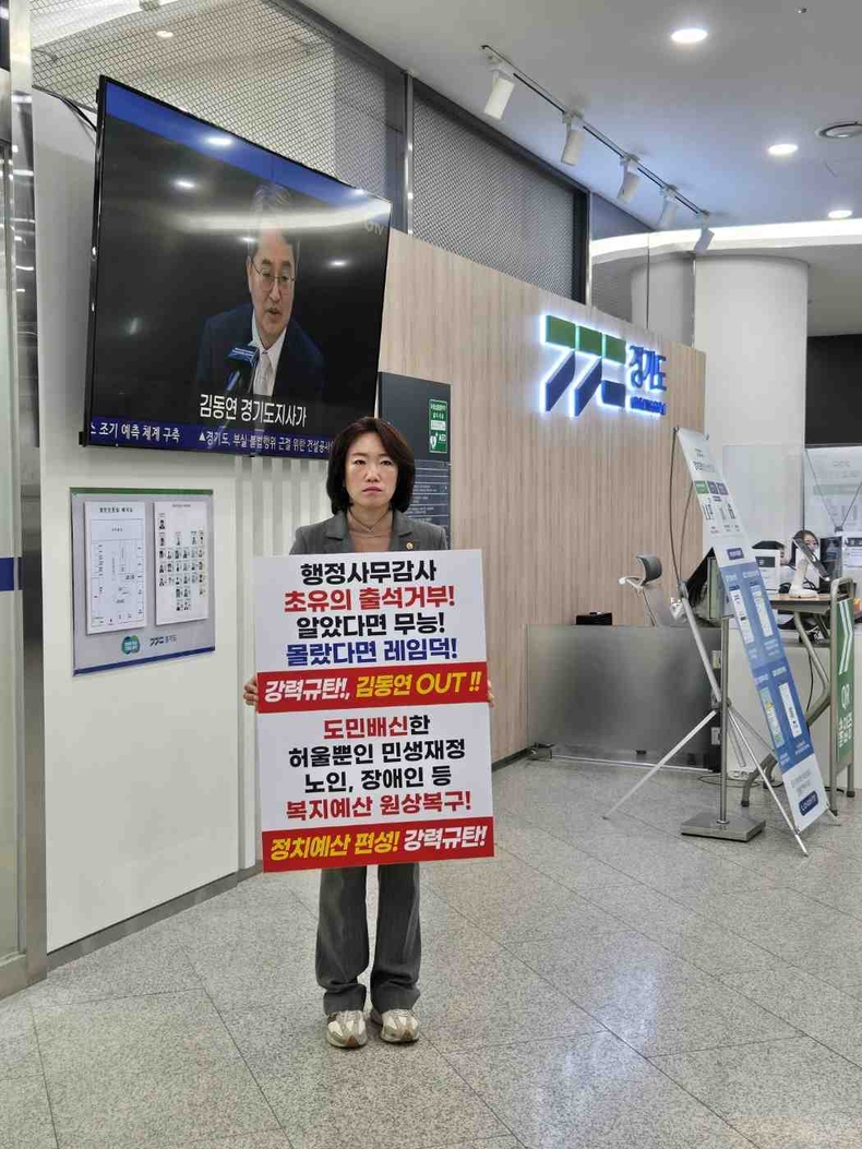 경기뉴스광장 정일수 기자 |이혜원 경기도의회 국민의힘 의원(양평2)은 20일 경기도청 1층 로비 앞에서 2026년도 본예산안 복지예산 대규모 삭감과, 경기도의회 운영위원회에서 발생한 경기도지사 비서실 및 보좌기관의 행정사무감사 불출석 사태에 항의하며 1인 릴레이 시위에 돌입했다.