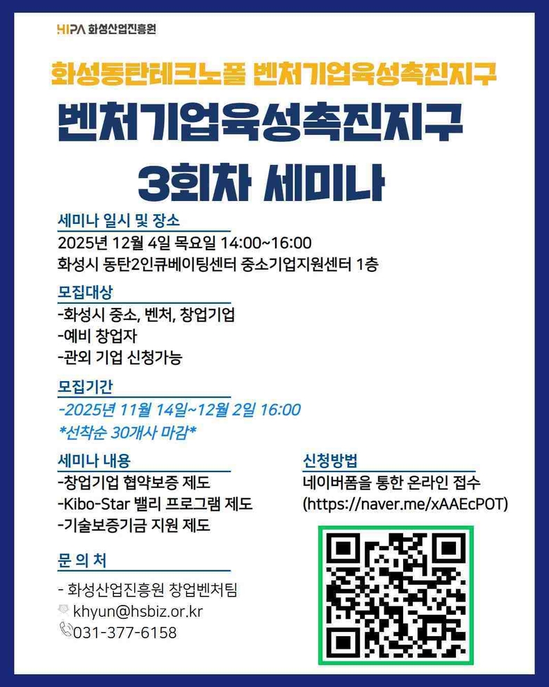 경기뉴스광장 정일수 기자 |화성산업진흥원이 오는 12월4일 화성시 중소기업지원센터에서‘2025년 벤처기업육성촉진지구 3회차 세미나’를 개최한다.