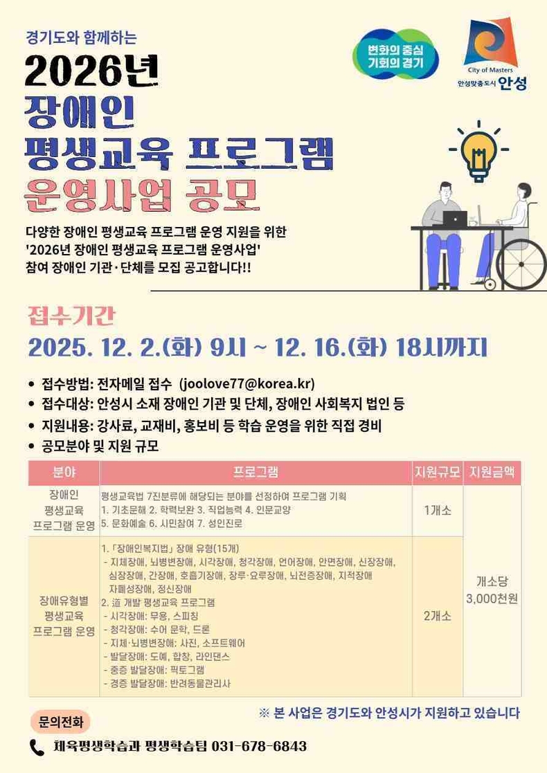 신청 대상은 안성시에 주소(등록)를 둔 장애인 평생교육 기관·단체이며, 신청 기간은 12월2일부터 16일까지이다.