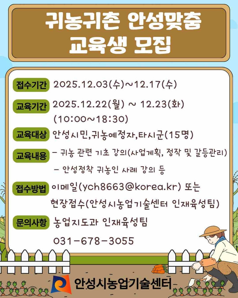 서동남 과장은 “귀농을 고민하는 분들이 사전 정보 부족과 갈등, 제도 이해의 어려움을 해소하고 안성에 안정적으로 정착할 수 있도록 실질적인 도움을 드리겠다”고 밝혔다.
