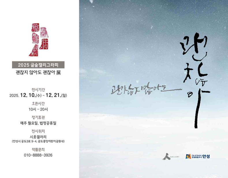 경기뉴스광장 정일수 기자 |안성시 공도 작은미술관 시옷갤러리는 오는 10일부터 12월21일까지 글숲 캘리그라피 작가들이 참여하는 전시‘괜찮지 않아도 괜찮아’전을 개최한다.