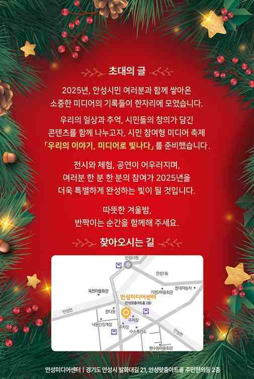 안성미디어센터 관계자는 “2025년 한 해 동안 시민들과 함께 만들어 온 다양한 미디어 활동의 성과를 나누는 의미 있는 자리”라면서 “전시, 체험, 공연, 시상식 등 풍성한 프로그램을 통해 안성시민들이 미디어를 더욱 가깝게 느끼고 즐길 수 있기를 바라며, 앞으로도 시민과 함께 성장하는 미디어센터가 되도록 꾸준히 노력하겠다”고 밝혔다.