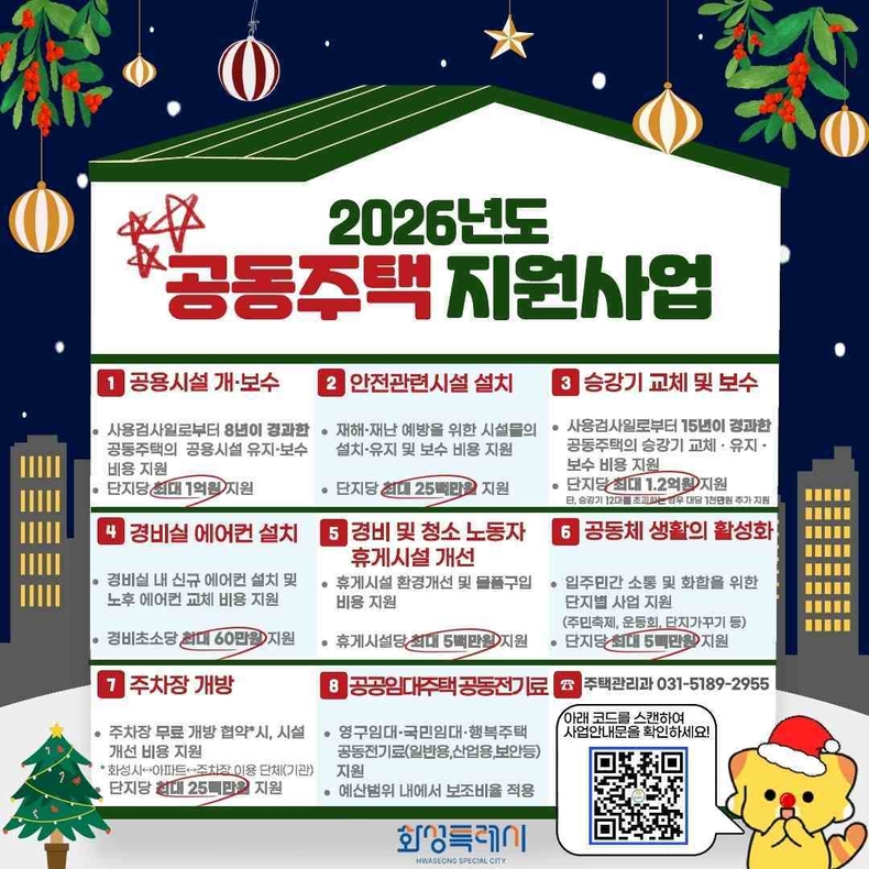 앞서 시는 안전하고 쾌적한 환경 조성을 위한 시민의 비용 부담 절감을 위해 지난해 12월 ‘화성시 공동주택관리 조례’를 개정해 ‘2025년도 공동주택 지원사업’의 대상과 범위를 확대한 바 있다.