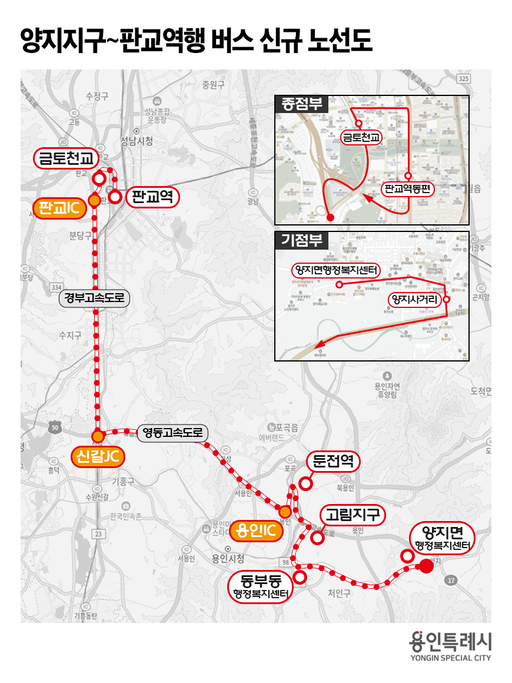 버스는 △양지면 행정복지센터 △양지사거리 △동부동 행정복지센터 △서울병원 △고림고∙ 유림2동 △유림동∙ 방축 △둔전역∙ 인정멜로디아파트 △금토천교 △판교역동편 등 정류소에 정차할 예정이다.