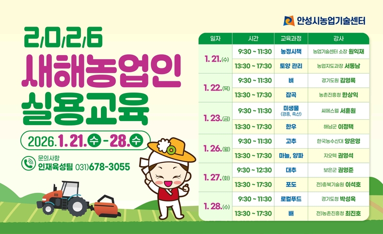 경기뉴스광장 정일수 기자 |안성시가 오는 21일부터 28일까지 6일간 새해농업인 실용교육을 12회 추진한다고 5일 밝혔다.