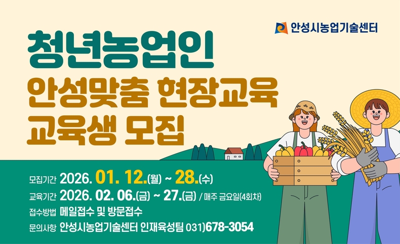 모집 기간은 1월12일부터 28일까지이며, 모집 인원은 15명으로, 안성시 청년농업인과 창농을 희망하는 만 18세 이상 40세 미만 청년을 대상으로 한다.