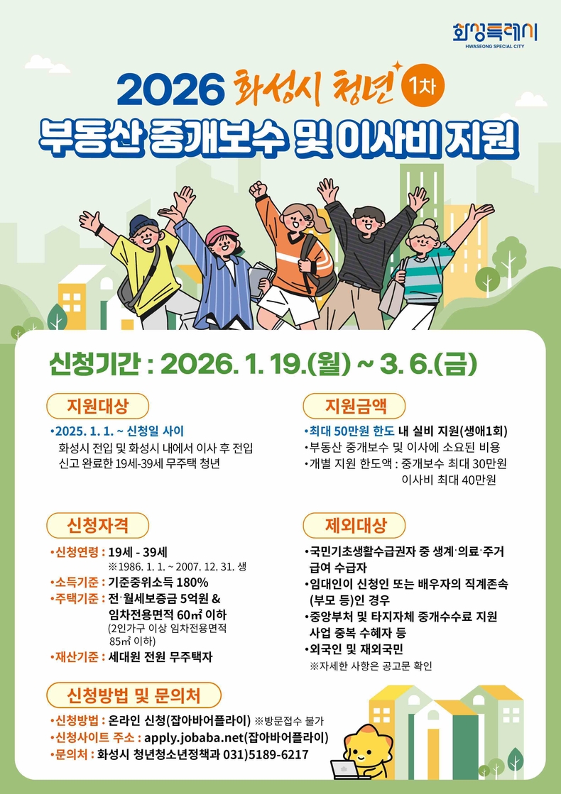 경기뉴스광장 정일수 기자 |화성특례시가 19일부터 3월6일까지 청년들의 주거비 부담 경감 및 정주 여건 향상을 위한‘2026년 상반기 청년 부동산 중개보수 및 이사비 지원사업’신청을 받는다.