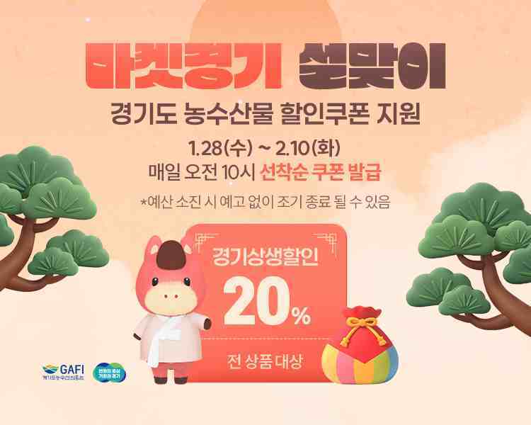 경기뉴스광장 강성규 기자 |매일 오전 10시 경기도 농수축산물 온라인쇼핑몰 ‘마켓경기’를 방문하면 경기미, 농수축산물, 가공식품 등 모든 상품을 20% 할인가에 구매할 수 있는 ‘2026 설맞이 할인쿠폰’이 선착순 지급된다.