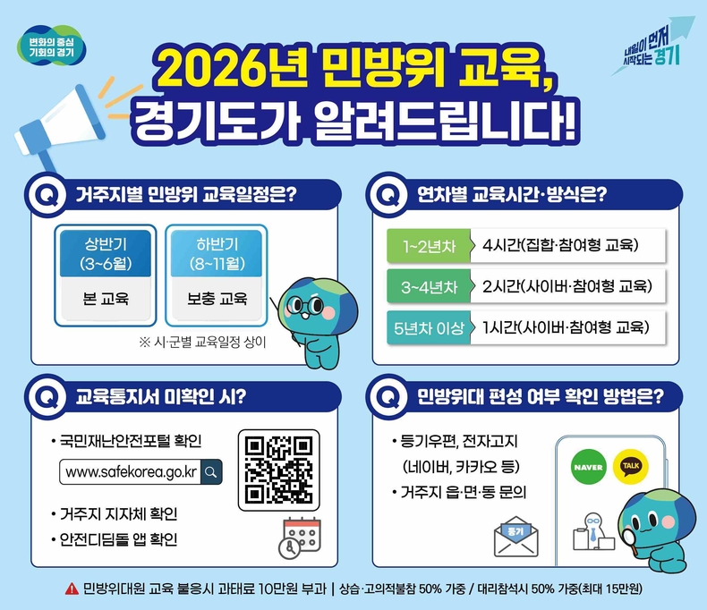 경기뉴스광장 강성규 기자 |경기도가 ‘2026년도 민방위 교육’과 관련해 도민들의 편의를 위해 시군별 문의가 많은 사항을 중심으로 교육대상·교육시간·교육방법을 안내했다.