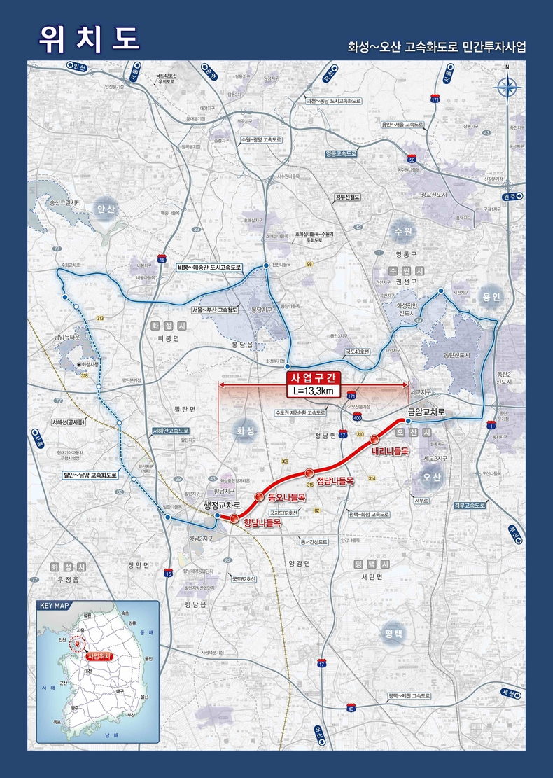 이 사업은 화성시 향남읍에서 오산시 금암동까지 약 13.3km 구간을 연결하는 왕복 4차로 자동차전용도로를 건설하는 것으로, 개통시 수도권 서남부 지역의 교통 혼잡 해소와 이동 시간 단축, 산업·주거지역 접근성 개선에 크게 기여할 것으로 기대된다.