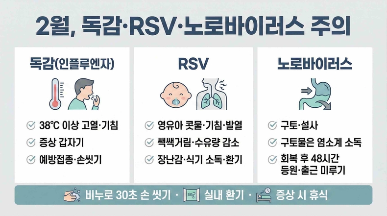 경기뉴스광장 정일수 기자 | 평택시가 2월은 실내 생활이 늘고 환기 부족으로 독감(인플루엔자)·호흡기세포융합바이러스(RSV)·노로바이러스 등 감염병이 유행할 수 있다며 시민들에게 개인위생 수칙 준수를 당부했다.