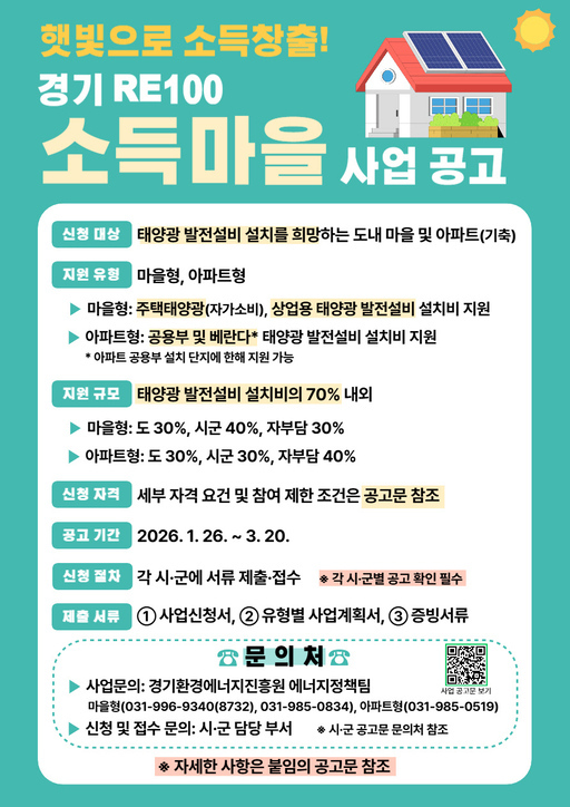 이 사업을 통해 태양광 발전설비를 설치할 경우 경기도와 고양시로부터 마을형은 설치비의 70%, 아파트형은 60%까지 보조금을 지원받을 수 있다.