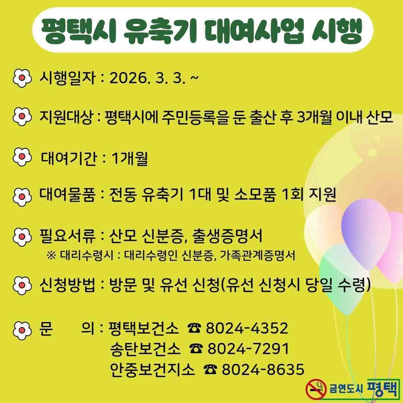 경기뉴스광장 정일수 기자 |평택시가 출산 초기 산모의 경제적 부담을 덜고 안정적인 모유 수유 환경조성을 위해 오는 3월3일부터 유축기 대여사업을 신규 시행한다고 23일 밝혔다.