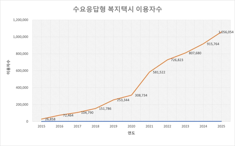 경기도는 지난해 ‘수요응답형 복지택시’ 이용자수가 105만6054명을 기록했다고 26일 밝혔다. 서비스를 시작한 2015년 2만6858명에서 10년 만에 이용자수는 39배, 참여 마을은 2015년 88개에서 2025년 867개로 9.8배 늘어났다.