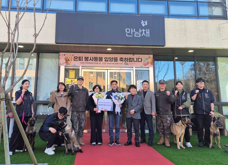축하식에는 2월26일 반려마루 여주로 다시 새롭게 데려온 은퇴군견 2마리도 동반 참석했다. 모두 정찰견으로 활동하다 은퇴한 훈련견으로 사전에 사람과의 친화도, 반려견으로서의 품성을 심사해 선발된 민간분양 대상견이다.