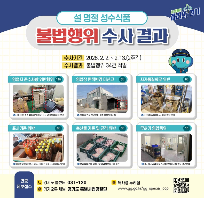 경기뉴스광장 강성규 기자 |경기도 특별사법경찰단이 설 명절 성수식품 불법행위를 수사해 영업자 준수사항 위반과 영업장 불법 확장 등 총 34건을 적발했다고 5일 밝혔다.