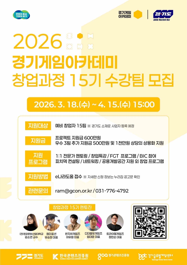 경기뉴스광장 강성규 기자 |경기도와 경기콘텐츠진흥원(이하 경콘진)이 대한민국 게임산업의 미래를 이끌어갈 ‘2026 경기게임아카데미’ 창업과정 15기 수강생을 4월15일까지 모집한다.