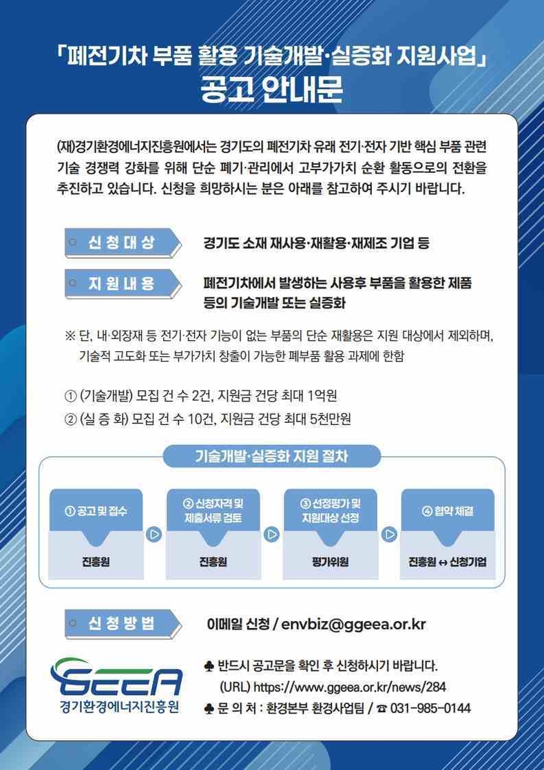 지원 대상은 본사, 공장, 연구소 가운데 1곳 이상이 경기도에 있는 기업이다. 선정된 기업에는 폐전기차 부품을 활용한 재제조·재사용 기술개발과 제품화에 필요한 비용을 지원한다.
