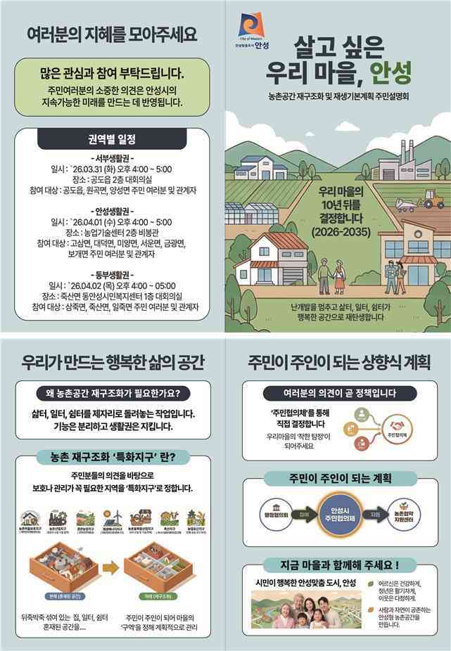 시는 주민설명회 이후에도 주민협의체 구성, 현장 포럼, 설문조사 등 추가적인 의견 수렴 절차를 지속적으로 운영해 ‘시민과 함께 만드는 안성 농촌의 미래’를 추진해 나갈 계획이다.